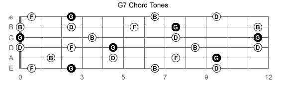 This next section will compare G7’s chord tones to the G Blues Scale, and it will show you why the Mixolydian mode fits a little bit better because the Mixolydian mode contains all of the chord tones. the Blues Scale however omits a couple notes, but it doesn’t leave any bad notes for you to hit. Let me show you…