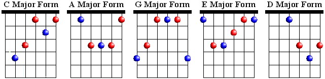This lesson will show where chords are in relation to each other. There is an order in which the chords go down the fretboard it is C-A-G-E-D. Each letter refers to a certain chord form or pattern. This pattern is shown in the diagram below. (Ex: C form, A form, etc.)