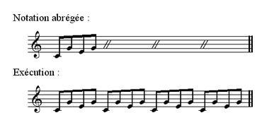 Lorsque le contenu d’une mesure doit être répété, on peut remplacer ce contenu de par deux points placés de part et d’autre d’un trait oblique. Ce signe de répétition est parfois remplacé par le double trait oblique surmonté d’un nombre exprimant la quantité de mesures concernées par cette répétition.