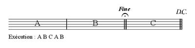 A l’instar du da capo, le renvoi est souvent accompagné du terme italien Fine ou bien, d’un point d’arrêt.