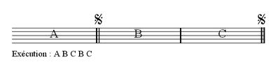 Deux barres de reprise — chaque barre de reprise est en fait une double barre de mesure précédée ou suivie de deux points — encadrent un fragment qui doit être exécuté deux fois — les deux points de chaque barre sont situés à l’intérieur du fragment concerné.