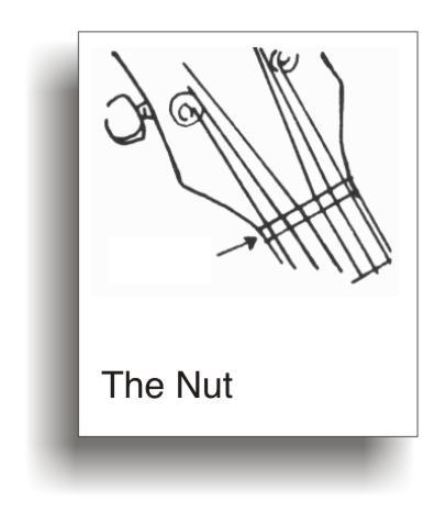First make sure the nut is sitting in its proper position. In other words, make sure there are no gaps between the nut and the areas it sits against. (Tight against the fingerboard, etc.) (See Fig. #1) If there are gaps, you will need to take this to your local repairperson to fix.
