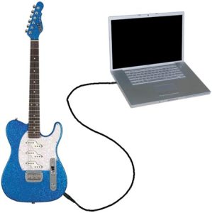 To connect your guitar to the Audio-In port you need a special cable or an adapter for your existing guitar cable. Why? A standard guitar cable has a 1/4″ phone plug on each end. A standard computer Audio-In port takes a 1/8″ stereo plug.