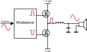 Les amplificateurs de classe D utilisent la modulation de largeur d’impulsion, la modulation de densité d’impulsions ou des formes plus avancées de modulation comme la modulation Sigma delta. Le signal d’entrée est converti en une série d’impulsions dont la valeur moyenne est directement proportionnelle à l’amplitude du signal à l’instant considéré.