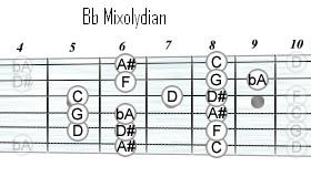 - On the IV play Bb Mixolydian. Guitar position-wise it might be easier to think F Dorian here and stay in the same position.