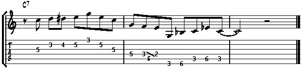 The first part uses the C Mixolydian scale (with a natural 3), the second half of the second bar uses the C minor pentatonic scale (with a flat 3).