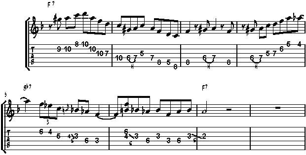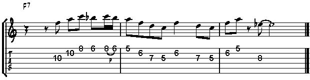 It starts with an F arpeggio, followed by a Dm7 arpeggio in bar 2. Note that the b7 of F7 is delayed until the last bar. Doing so creates variation and is a good technique to announce the chord change to Bb7.