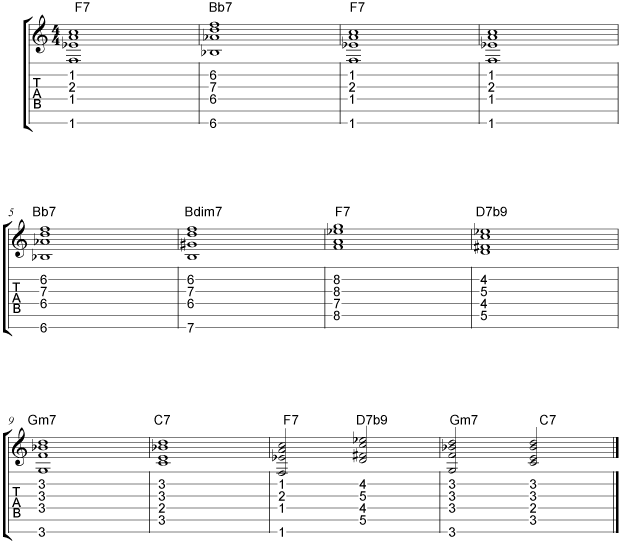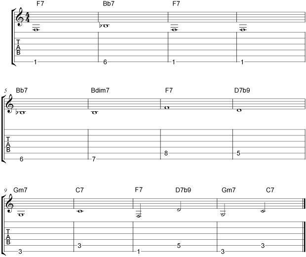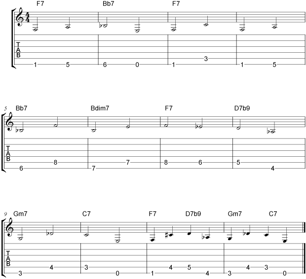 Now we are ready to take these same steps and apply them to any jazz tune, be it a blues based tune or standard 32 bar tune. You might want to try writing out the steps, as above, when first applying them to other tunes, and once you are proficient at writing them out try and walk/comp on the fly.