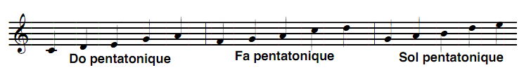 Et, réciproquement, une gamme majeure pentatonique appartient à 3 gammes majeures. Ex : Do majeur pentatonique appartient aux gammes majeures de Fa, Do et Sol (Fa et Sol sont voisines qui entourent Do dans le cycle des quartes ) :