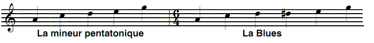 Si on utilise le 5ème mode de la pentatonique majeure de Do, on l’appellera La mineur pentatonique et si on rajoute augmentée de La on obtient la gamme blues de La :