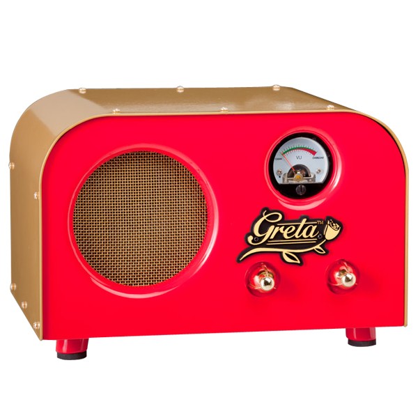 Il s’agit d’un pourtant d’un véritable ampli : ce joli poste de salon d’une puissance de deux watts est équipé d’un haut-parleur 4, d’un vumètre à l’ancienne, d’un volume et d’une tonalité. Son enceinte délicieusement vintage se compose de panneaux de bois en finition rouge brillant à l’avant comme à l’arrière, surmontés d’un capot doré pour une meilleure isolation, d’un logo Greta en lettres anglaises sur le panneau avant et des petits patins sous les pieds.
