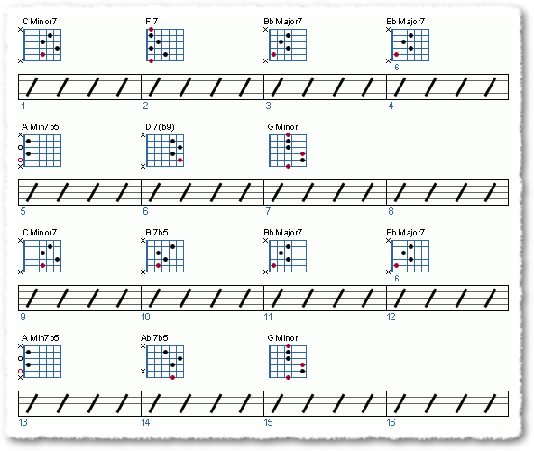 In this progression, for example, one could easily substitute tritones in both the minor and major 2-5-1’s.