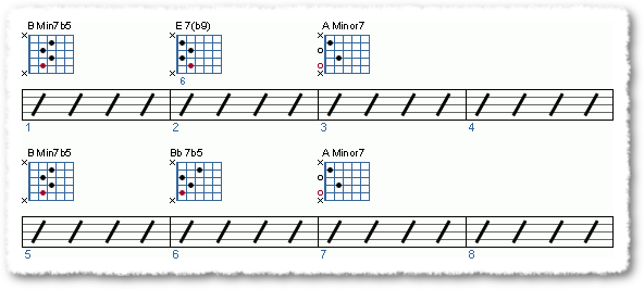 For example: Bm7b5 – E7b9 – Am7 becomes Bm7b5 – Bb7b5 – Am7.