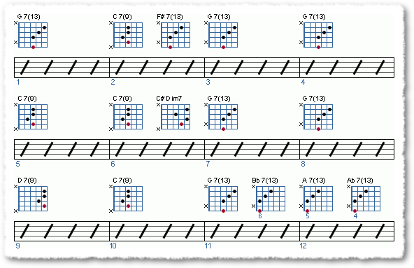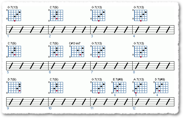 Take a 12-bar blues. The straighforward chords are usually ‘jazzed up’ by playing 13ths, 9ths and #9s like this: