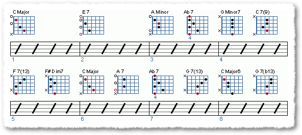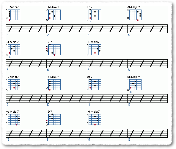 Incidentally, it doesn’t matter what kind of chord you use in a tritone substitution. They can be altered or not. Here’s the first 16 bars of a well-known standard. On the next page we’ll do some substitution.