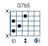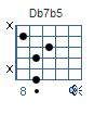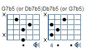 You can see also here that you can play the Db7b5 at the 4rd fret where the notes are Db, G, B, F. In the same way the G7b5 could also be played at the 10th fret where they become G, Db, F, B.