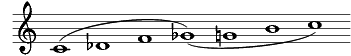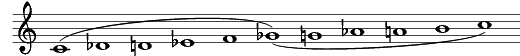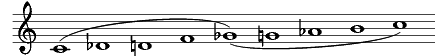 Messiaen’s first mode, also called the whole-tone scale, is divided into six groups of two notes each. The intervals it contains are tone, tone, tone, tone, tone, tone – it has two transpositions and one mode.
