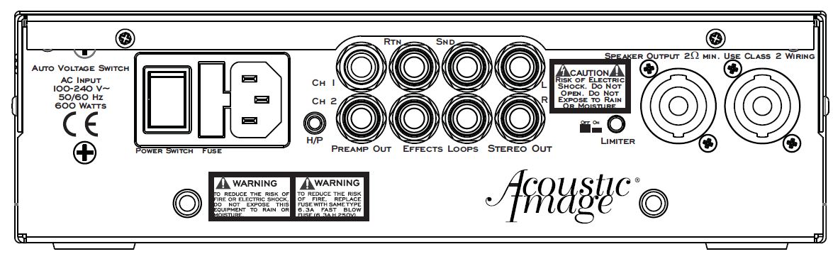 - External Speaker Output: Speakon type (pole 1), 2Ω min load including internal speakers, if connected