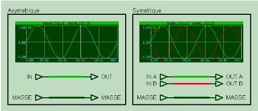 En asymétrique, le signal électrique à véhiculer est transporté sur un seul fil, et un second fil qui est le plus souvent la masse, sert de référence, de blindage et de retour signal. En symétrique, le signal électrique à véhiculer est transporté simultanément sur deux fils A et B. Chacun de ces deux fils reçoit la même tension électrique mais en opposition de phase l’un par rapport à l’autre, et un troisième fil de masse sert de blindage. Si par rapport à la masse, le signal électrique augmente sur le fil A, il diminue sur le fil B