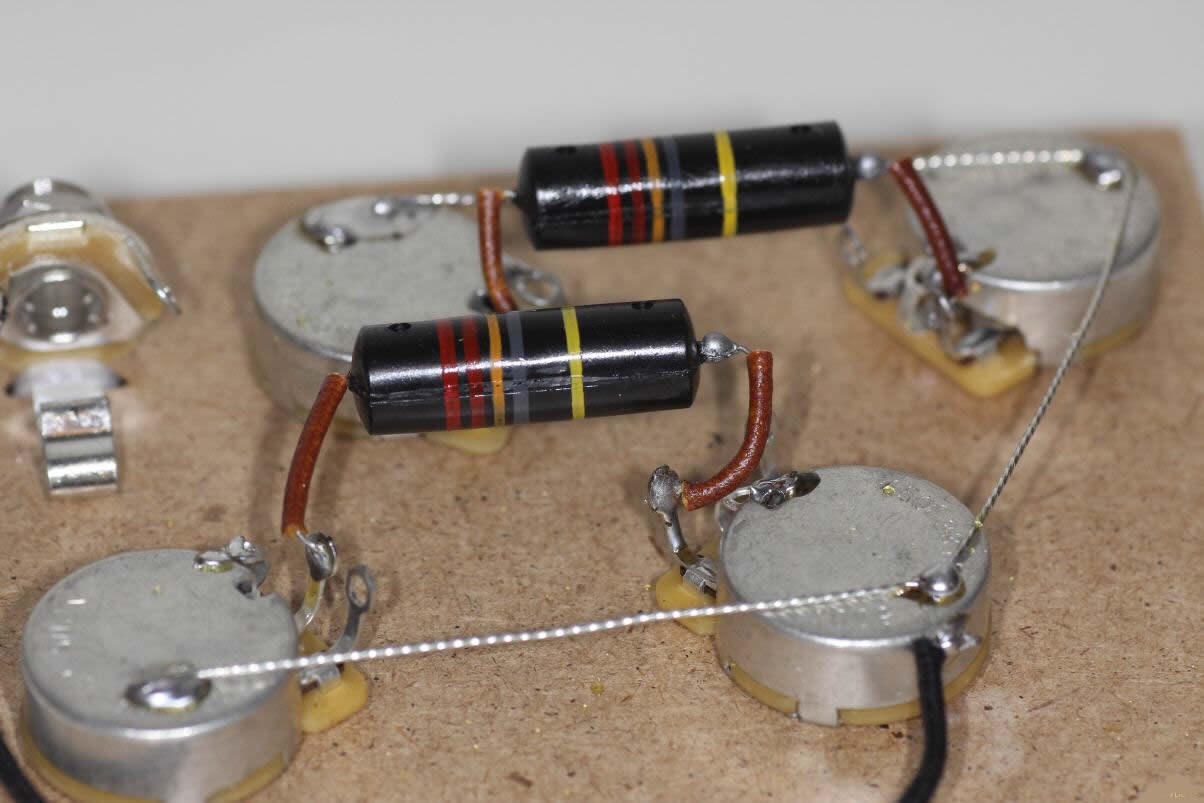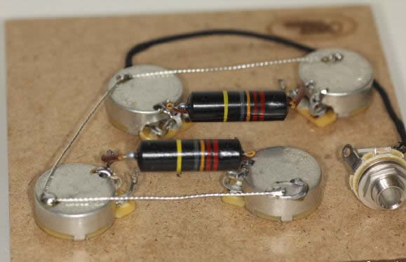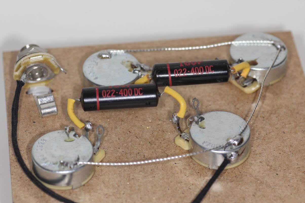 Une fois les trous agrandis, remontez tout avec les nouveaux composants, et câblez selon le schéma “Gibson historique 50′”. C’est à dire de la façon laquelle étaient câblées les premières Les Paul.Le résultat est impressionnant. Un son clair à tomber quand on ouvre légèrement le potard de volume. Volume de la guitare à fond, un sustain infernal sur le micro manche (Gary Moore…., une distorsion très rock, très, vintage, on se prend toute suite pour Jimmy Page. Vous passez d’un son clair cristallin à la distorsion rien qu’en jouant avec le volume de la guitare sans perdre de fréquences.