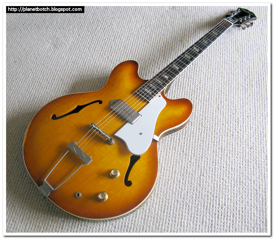 Looking at the guitar you may be tempted to think: “Well I couldn’t do much with that”, but once you start to play it you realise it covers more styles than you imagined. It’s not gonna be the choice of heavy metal players, but it fits well into jazz, country, 1970s rock, etc. Whereas some guitars just sound wrong in domains where you wouldn’t expect to find them, this one sounds absolutely right, and actually very refreshing, since it stamps its own personality onto whatever it does. But of course where the one-pickup Casino really excels is in the genre of blues. You can take the work of BB King, Chuck Berry, Stevie Ray Vaughan, and even Hendrix, play it on this guitar, and it sounds like it was made for the job. Different from the original sounds, but no less exciting. If you use an amp at home for practice at relatively low volume, this type of guitar can be immensely inspiring to create with. With an amp set at ‘home’ volume, the acoustic sound from the guitar’s ‘f’ holes blends with the amplified sound to give a fantastic pseudo-stereo effect. You can just play one chord and it sounds brilliant.